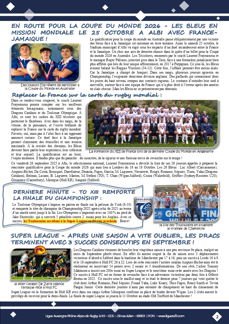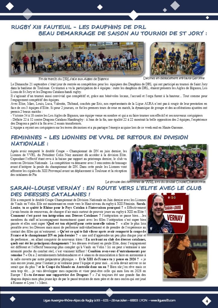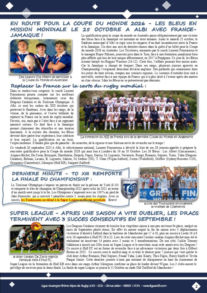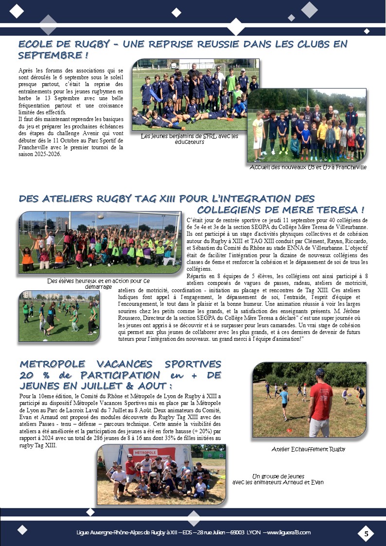 Vous trouverez ci-joint le bulletin N°144 de Septembre 2025 de la Ligue Auvergne Rhône-Alpes de Rugby à XIII avec en Une » Coup d’envoi saison 2025-2026 ! » et aussi parmi les faits marquants :