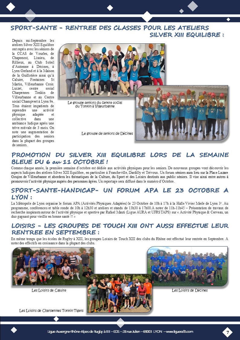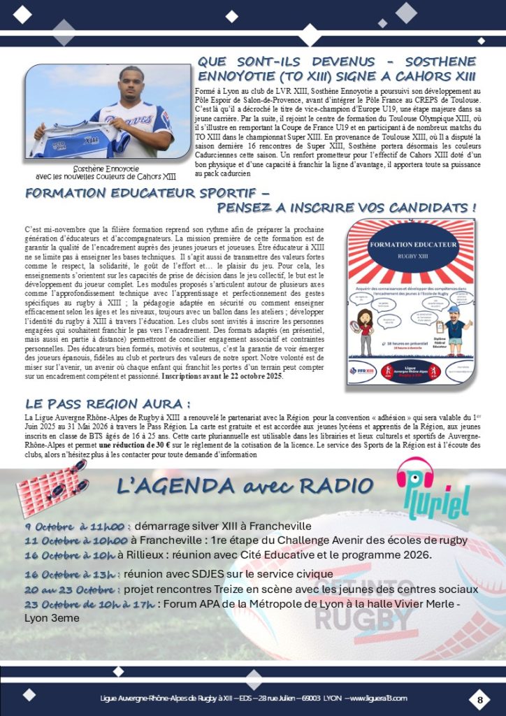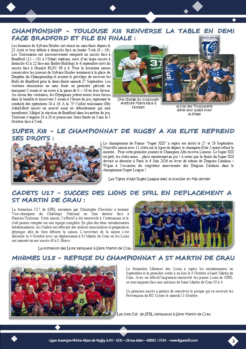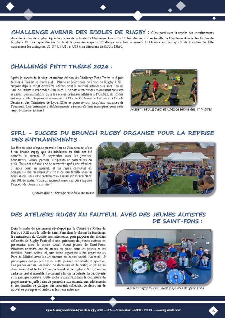 Vous trouverez ci-joint le bulletin N°144 de Septembre 2025 de la Ligue Auvergne Rhône-Alpes de Rugby à XIII avec en Une » Coup d’envoi saison 2025-2026 ! » et aussi parmi les faits marquants :