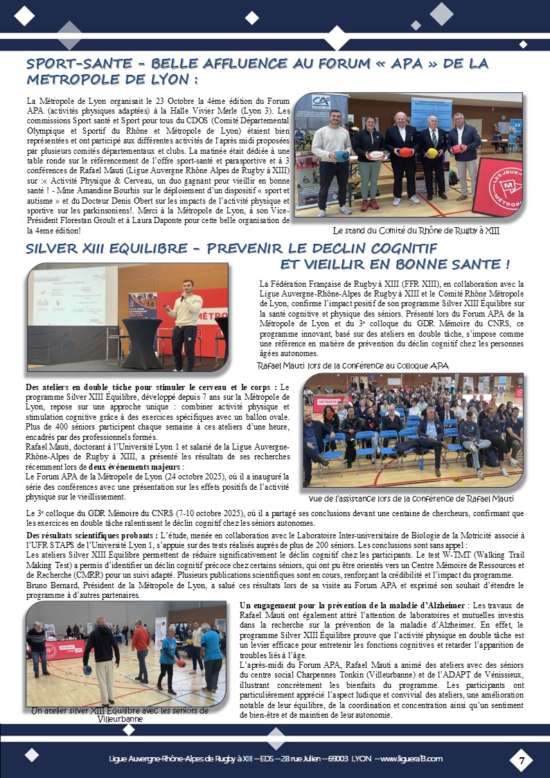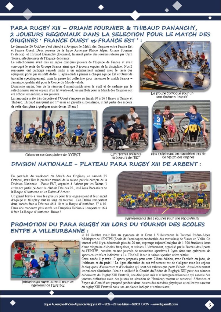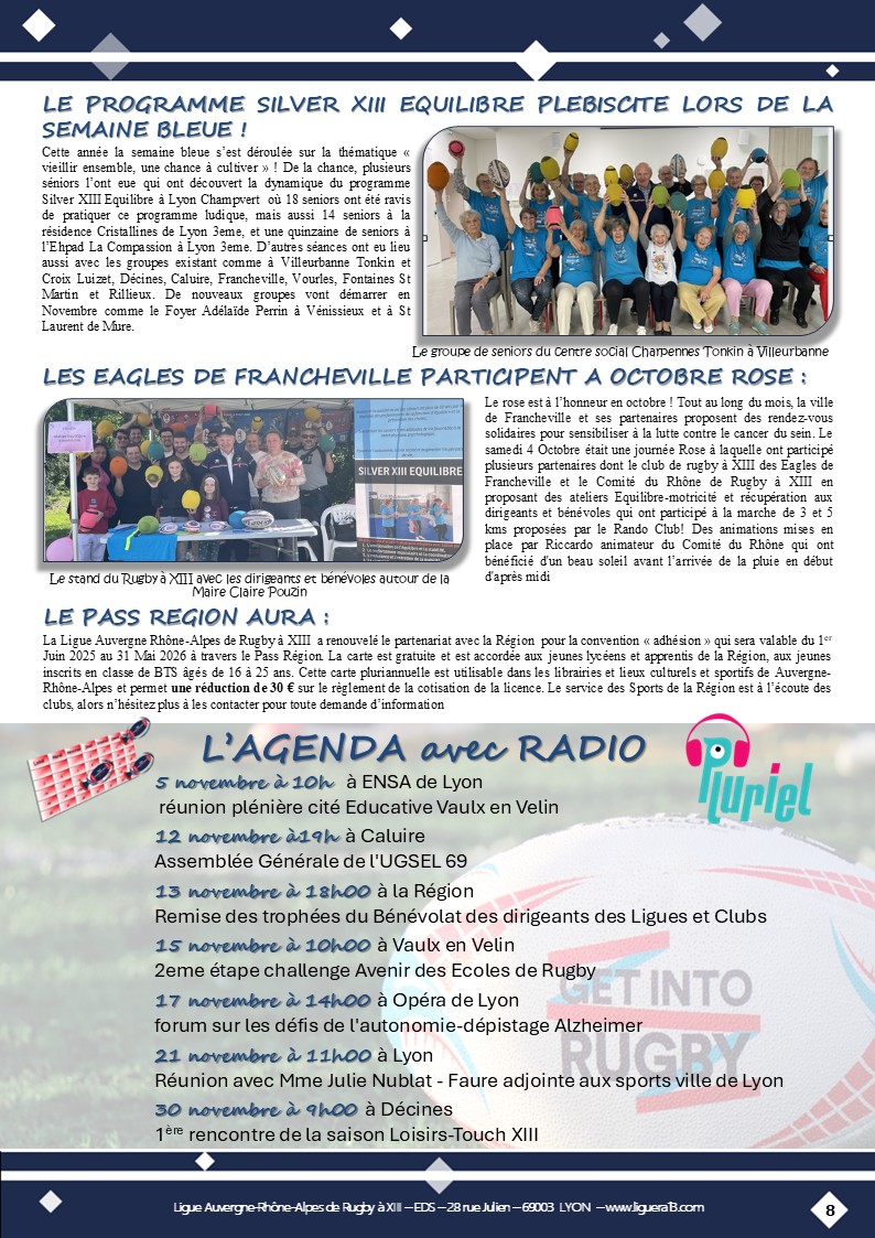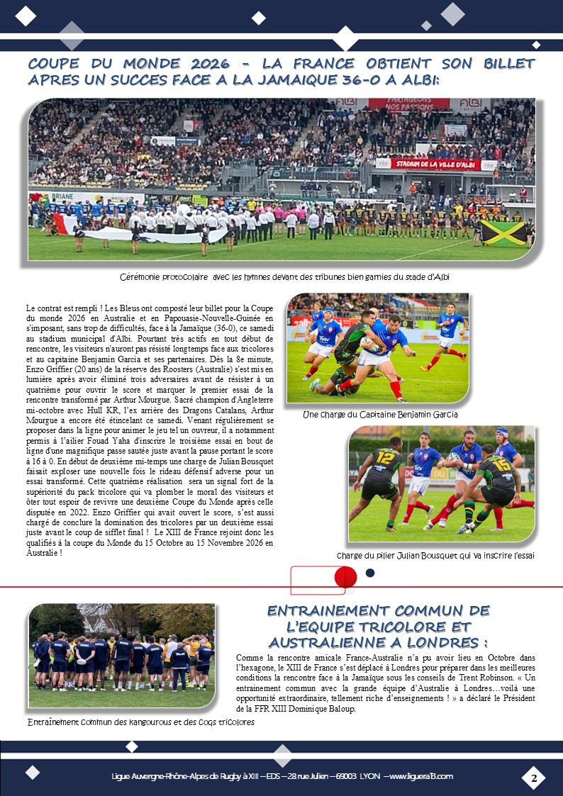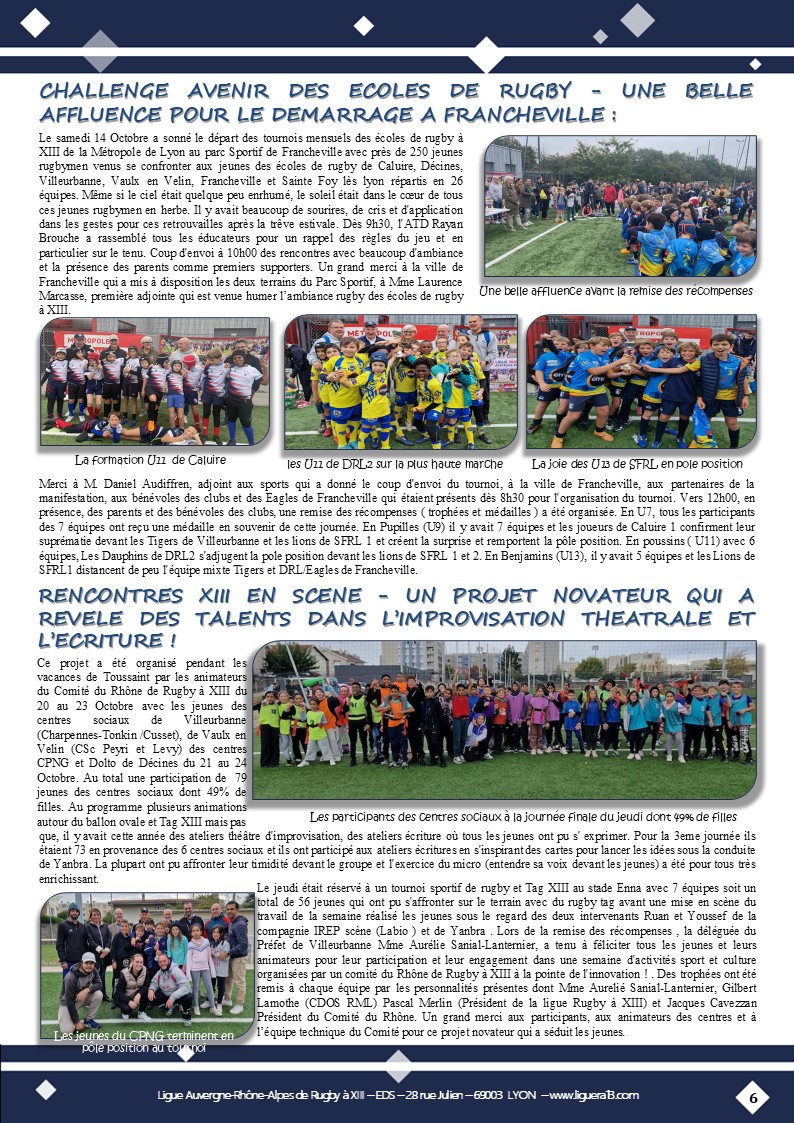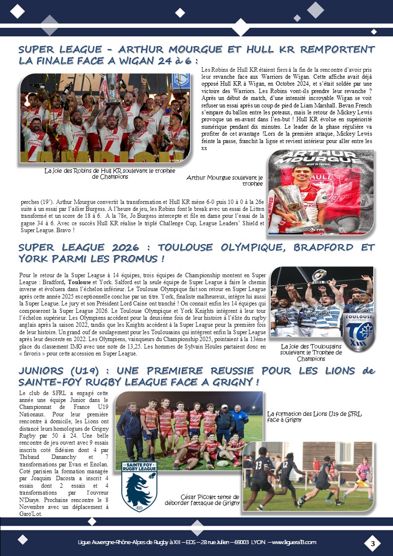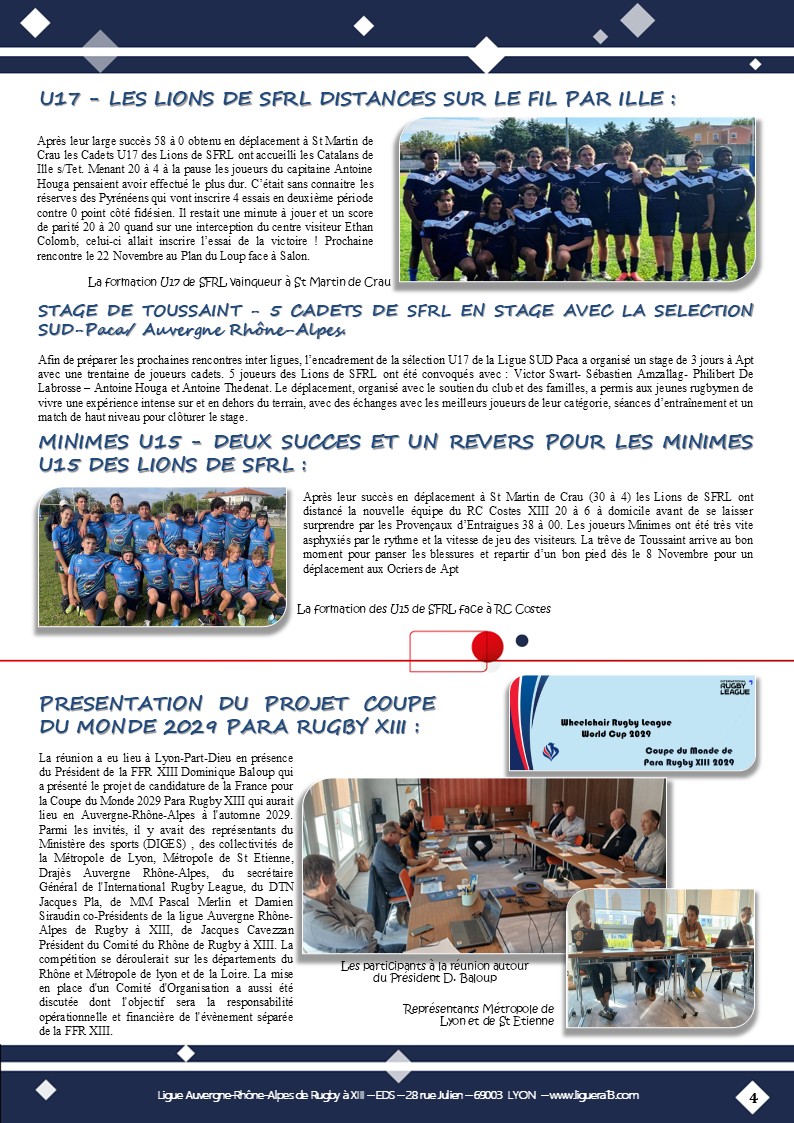 Vous trouverez ci-joint le bulletin N°145 de Octobre 2025 de la Ligue Auvergne Rhône-Alpes de Rugby à XIII avec en Une » SFRL- Des jeunes engagés dans toutes les Catégories! » et aussi parmi les faits marquants: