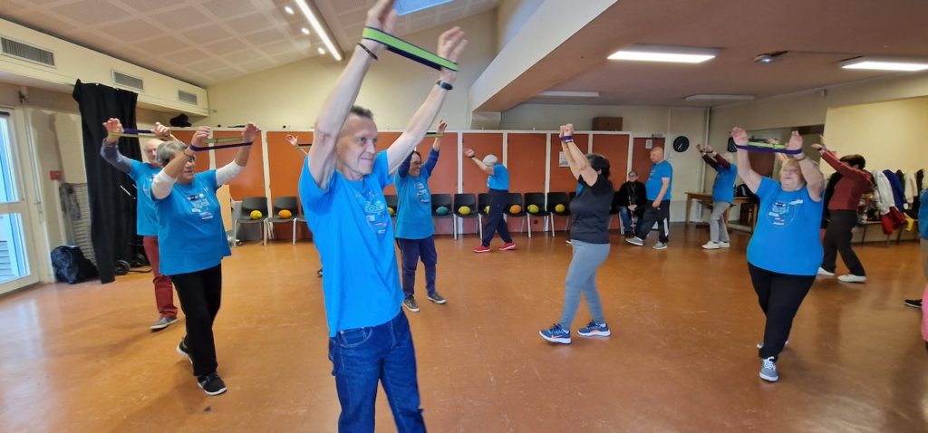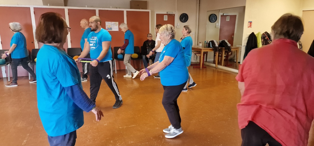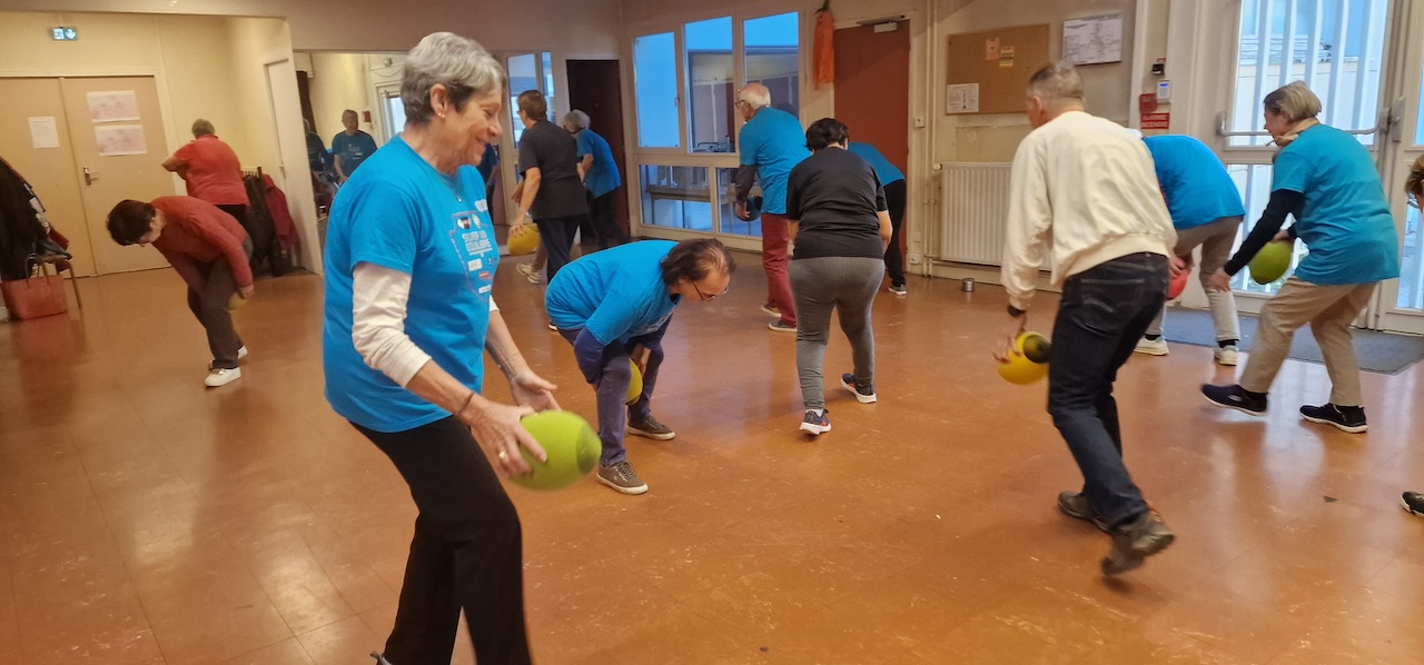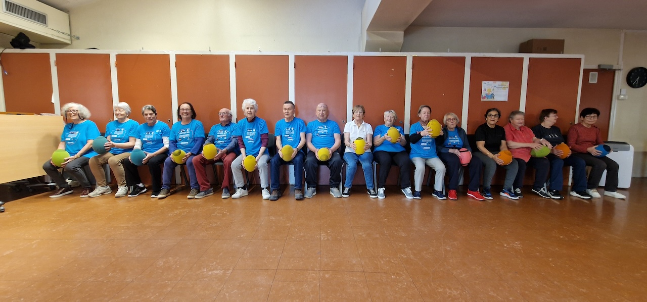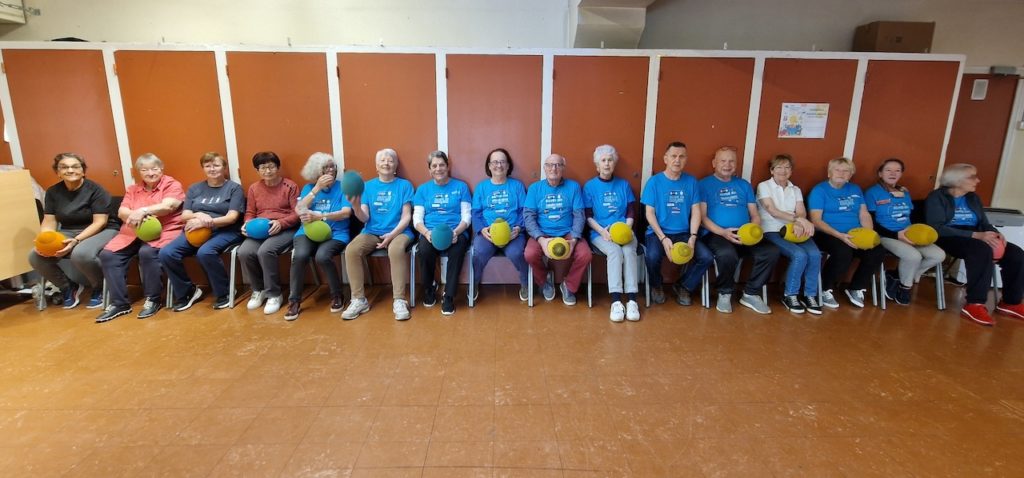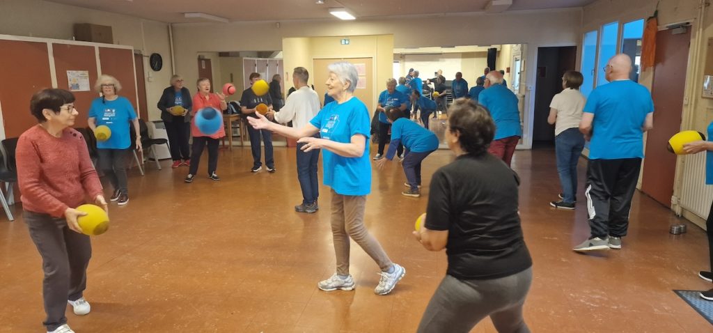 Au menu de cette seance plusieurs ateliers ludiques enchainés avec enthousiasme et dans la bonne humeur en commençant par un échauffement déplacement montée de genou, talon fesse, déroulé puis atelier renforcement haut et bas du corps – ateliers équilibre -coordination -endurance-marche à 3 temps – et des étirements et assouplissements en fin de séance.