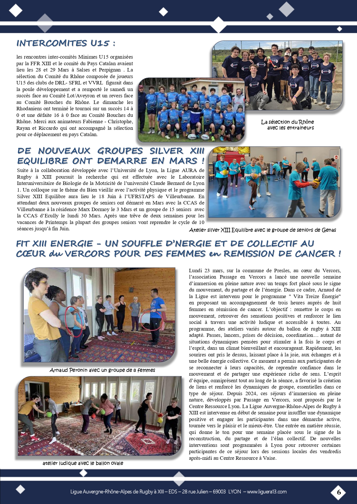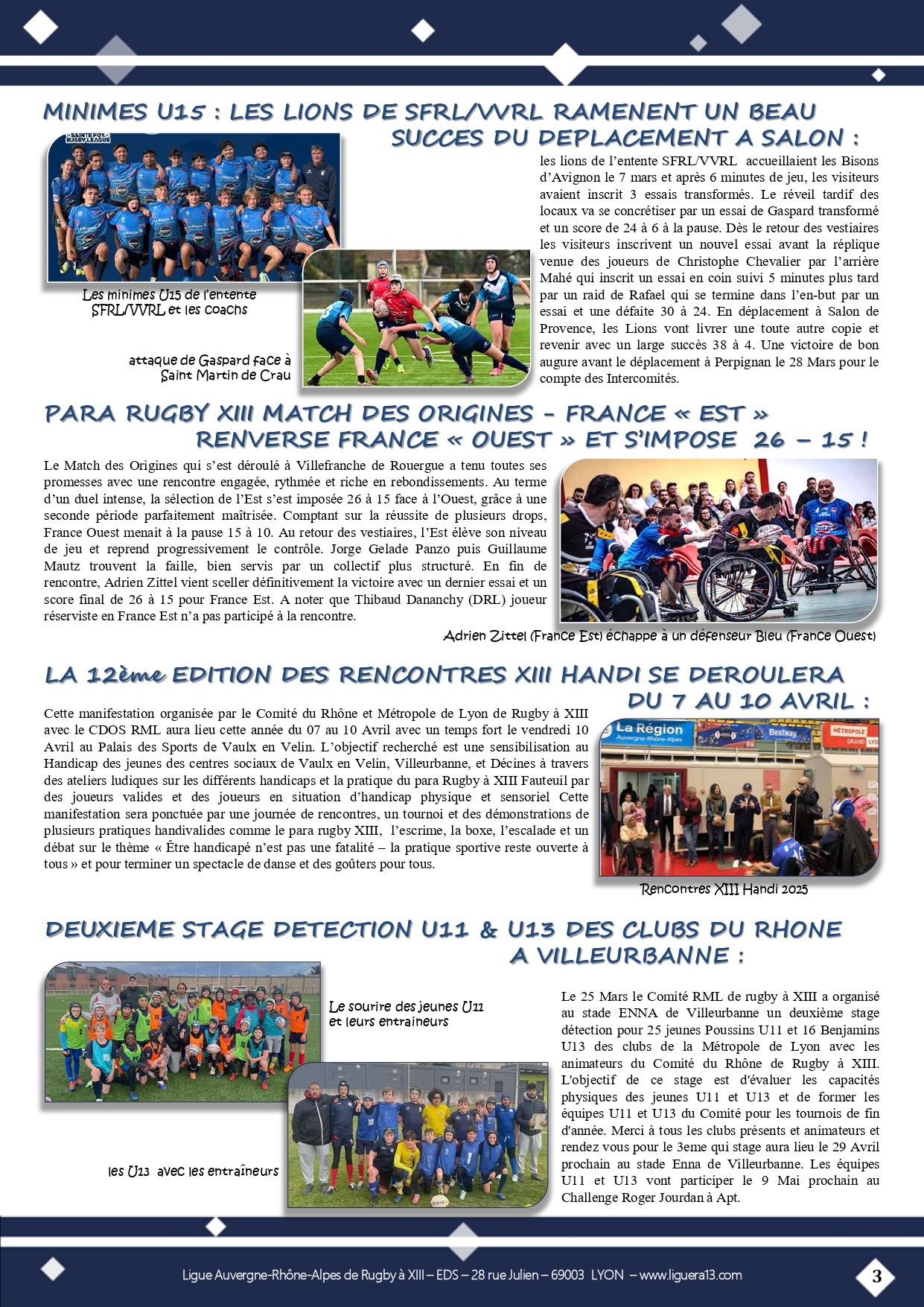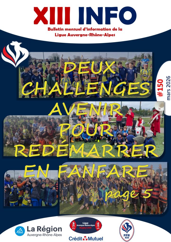 Vous trouverez ci-joint le bulletin N°150 de Mars 2026 de la Ligue Auvergne Rhône-Alpes de Rugby à XIII avec en Une » Deux challenges Avenir pour redelarrer en fanfare! et aussi parmi les faits marquants: