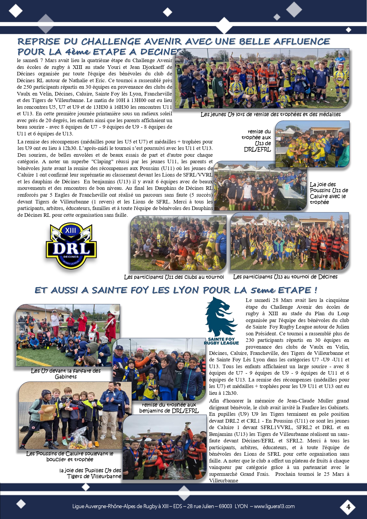 – Reprise du Challenge Avenir des Ecoles de Rugby avec une belle affluence pour la 4eme étape à Décines, et aussi à Sainte Foy lès lyon,