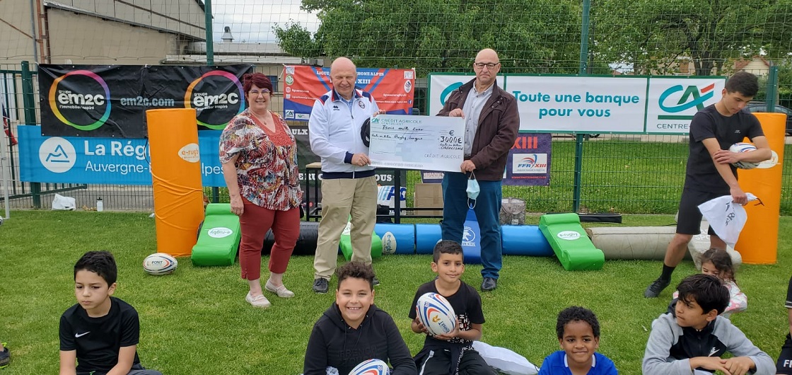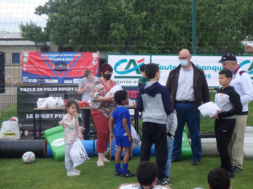 Ce mercredi après l’entraînement hebdomadaire des jeunes Lions du Vaulx en Velin Rugby League et malgré une météo pluvieuse, le Président de la Ligue AURA Jacques Cavezzan accompagné de M.Laurent Joannard Président de la Caisse Locale Lyon Est 7 chemins du Crédit Agricole Centre Est partenaire du club et du Comité du Rhône ont organisé autour de Sébastien Aguerra, responsable de l’ Ecole de rugby du club à la mise en place de l’Opération un ballon pour tous de la FFR XIII Crise sanitaire oblige, la remise des ballons aura lieu cette année dans un sac dédié contenant le ballon et un protège dent offert par la FFR XIII et le Président de la Ligue Jacques Cavezzan a rappelé l’objectif de cette opération « un ballon pour tous – » mise en place par la FFR XIII « car il s’agit de faire un geste fort en faveur de la formation et plus précisément en faveur des jeunes des catégories Premiers-Pas à Benjamins de toutes les écoles de rugby. Ce ballon, a – t -il ajouté. Ce ballon vous permettra de jouer avec vos parents, vos frères et soeurs, vos copains chez vous, car c’est un âge où il faut apprendre à partager le ballon ! « . Ensuite ce fut le moment tant attendu par tous les enfants avec la remise d’un ballon et du protège dent à chaque licencié par catégorie. Le Président de la Caisse Locale Lyon Est 7 chemins est intervenu pour féliciter le club pour cette opération fédérale et aussi pour avoir été lauréat de l’appel à projet de la grande cause Mutualiste du Crédit Agricole Centre Est d’Avril 2020. En raison de la crise sanitaire, la remise du Chèque avait dû être reportée et il était ravi de pouvoir récompenser les valeurs du rugby qui sont développées par le club de Vaulx en velin Rugby League avec toutes les actions « hors les murs » en absence de terrain de rugby. Jacques Cavezzan de son côté a remercié chaleureusement le Président Laurent Joannard et aussi Pascale Varagnat de la Caisse Locale Lyon Est 7 Chemins pour leur fidélité et le soutien dans les actions de développement du Rugby à XIII au sein du club du VVRL et du Rugby XIII Fauteuil avec le Comité du Rhône de Rugby à XIII. Un goûter a ensuite été servi à tous les enfants.