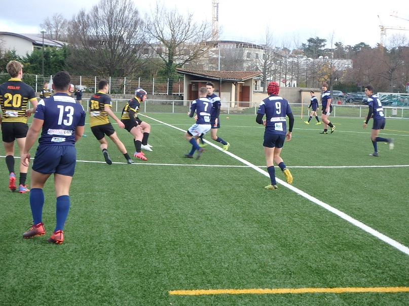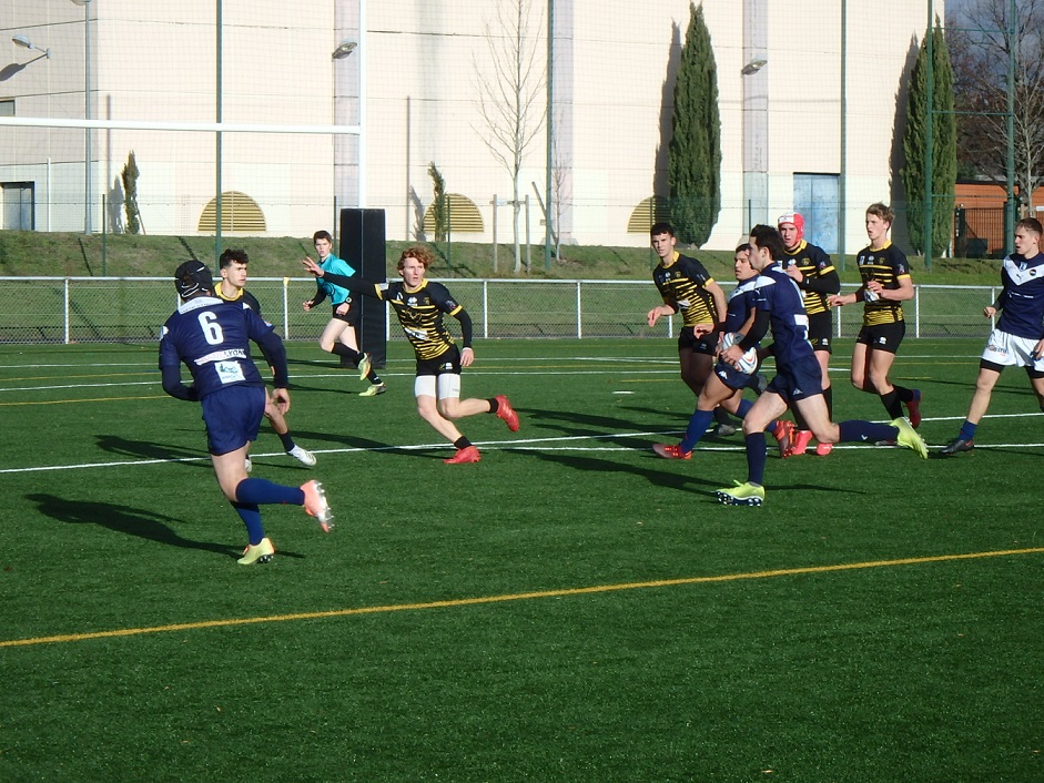 Les Lions U17 de Sainte Foy Rugby League restaient sur une large victoire de 15 essais à 0 face à l’académie Rugby League. Cette fois c’était le leader Salon de Provence avec une dizaine de joueurs issus du Pôle de Salon qui foulait la pelouse du Stade du Plan du Loup. Dès le coup d’envoi les visiteurs prennent la direction des opérations avec deux essais en débordement et un score de 12 à 0. La réplique ne se fait pas attendre et à la 5e minute Paul Meryl après un départ derrière le tenu, s’infiltre et marque un essai transformé et il récidive trois minutes plus tard pour ramener le score à égalité 12 à 12 au quart d’heure de jeu. Vexés, les visiteurs accélèrent la circulation de balle et vont reprendre la marche en avant et inscrire 3 nouveaux essais transformés par Enzo. De son côté les Lions continuent à attaquer, et Paul Meryl, bien servi, va perforer le rideau défensif pour son troisième essai. Juste avant la pause les Provençaux inscrivent deux nouveaux essais par Enzo Griffier pour un score de 42 à 18 pour Salon XIII.A la reprise Les Lions de Christophe Chevalier tentent de revenir au score et ils vont y parvenir par deux belles attaques ponctuées de deux essais par Paul Meryl et Wassim. Raphaël Gabet rajoute un essai à la 50e minute suivi de Thomas Couturier décalé à l’ aile par Wassim de sorte que le score n’est plus que de 54 à 40 à l’heure de jeu. Mais dans les dix dernières minutes, le centre visiteur Enzo Griffier passe la ligne d’en but à deux reprises pour deux nouveaux essais transformés par lui-même… C’est Wassim en débordement qui inscrit l’ultime essai de la rencontre à la corne pour une large victoire des Provençaux 72 à 44 qui était attendue. A noter la belle réplique donnée par les Lions de SFRL. Une belle rencontre de jeu ouvert avec un total de 20 essais et d’une grande correction. Place maintenant aux vacances avant une reprise de la compétition mi-Janvier et un déplacement à Carpentras. A noter que 3 lions U17 de SFRL (Rayan Bonte – Paul Meryl Chevalier et Wassim Mouelhi ont été retenus pour le deuxième stage de détection qui aura lieu les 20 et 21 Décembre à Toulouse, en vue de former l’équipe de France U17 qui rencontrera l’Angleterre au printemps prochain. .