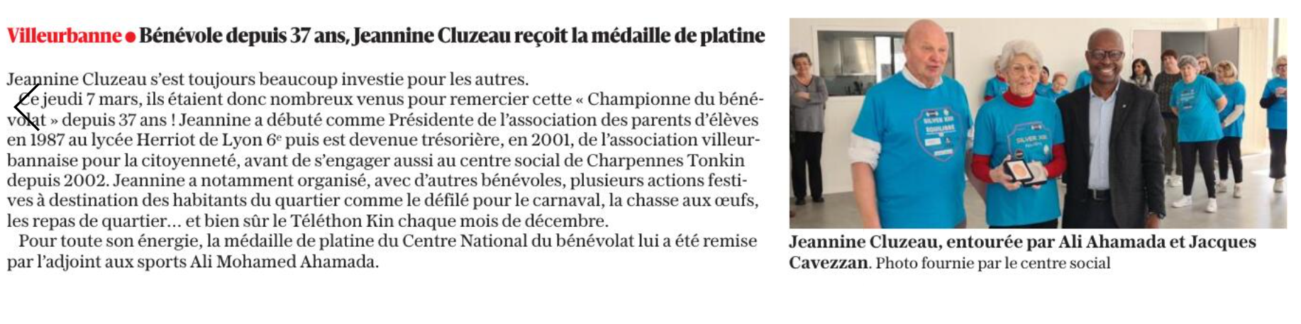 Ce jeudi avait lieu la reprise du programme silver XIII Equilibre au centre social du Tonkin après une trêve de 2 semaines pour les vacances de Février. A cette occasion le Président du Comité Rhône et Métropole de Lyon rugby à XIII Jacques Cavezzan a choisi d’honorer une Championne du bénévolat qui depuis 37 ans oeuvre au service de plusieurs associations villeurbannaises. Qui ne connaît pas Jeannine Cluzeau, une championne du bénévolat sur le quartier du Tonkin ? Elle a débuté comme Présidente de l’association des parents d’élèves en 1987 puis trésorière en 2001 de l’association villeurbannaise pour la citoyenneté puis au centre social de Charpennes Tonkin de 2002 à maintenant mais aussi au groupe d’animation Charpennes Tonkin, au Conseil de quartier Charpennes Tonkin et animatrice à la commission animation du quartier qui lui permet de réaliser avec une équipe de bénévoles plusieurs actions festives à destination des habitants du quartier avec notamment chaque année depuis plus de 15 ans le défilé pour le carnaval, la chasse aux oeufs, les repas de quartier, la fête de la jeunesse et du sport, la biennale des associations, le défilé aux lampions pour le 8 décembre et aussi le Téléthon’Kin chaque mois de décembre. La médaille de Platine du Centre National du bénévolat lui a été remise par l’adjoint aux sport Ali Mohamed Ahamada qui a tenu à son tour à remercier Jeannine et son époux Bernard pour toutes ces actions bénévoles menées sur le quartier du Tonkin de Villeurbanne depuis un quart de siècle…J’ajouterai une autre action lors des périodes d’élections, Jeannine fait partie avec son mari Bernard des volontaires qui donnent beaucoup de leur temps pour tenir les bureaux de vote . Jeannine a tenu à remercier le Centre social du Tonkin où elle est toujours présente comme bénévole et le Président Jacques Cavezzan. Celui-ci de conclure: voilà un palmarès impressionnant qui méritait bien d’être mis en lumière en cette année Olympique où le bénévolat est face à une érosion depuis la crise sanitaire ! ![]()